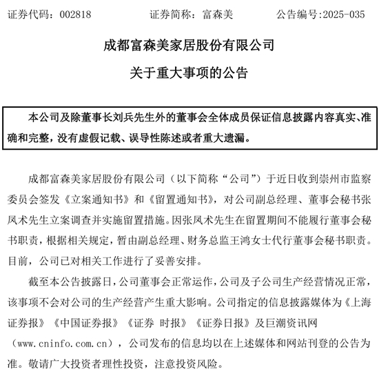 西南地区最大家居卖场企业富森美(002818.SZ)在董事长刘兵被留置四个月后,再次发布高管留置公告。