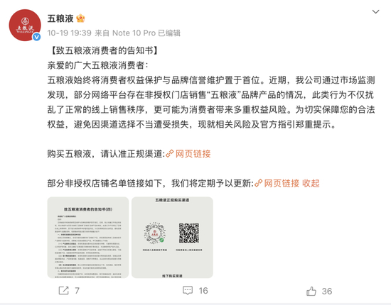 面对线上渠道的乱象,上个月,五粮液发布了“致消费者告知书”,直接点名46家非官方授权店铺,各大电商的第三方店铺都有“上榜”。