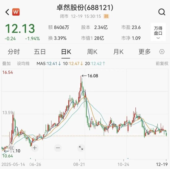 截至12月19日收盘,卓然股份股价报12.13元/股,总市值为28亿元。