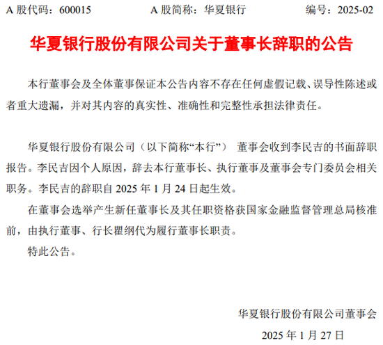 1月27日,在2025年春节前的最后一个工作日,华夏银行发布一则公告,董事会收到李民吉的书面辞职报告,因个人原因辞去董事长、执行董事等相关职务,自2025年1月24日起生效。