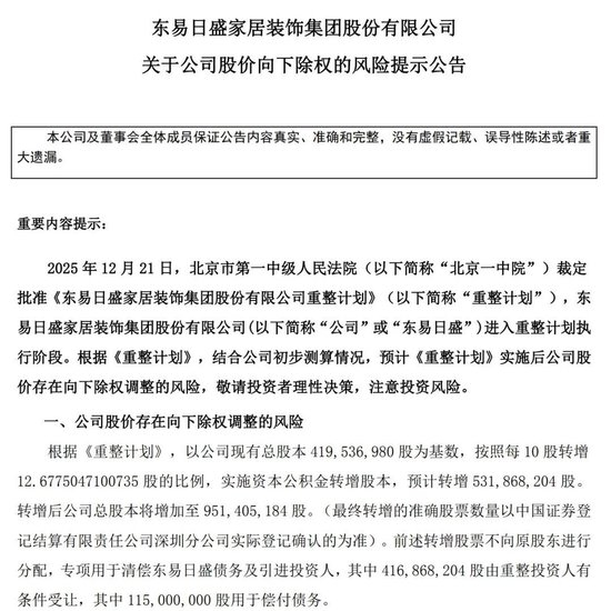 12月23日晚间,*ST东易发布关于公司股价向下除权的风险提示公告,披露本次重整中公司以资本公积金转增股本的平均价格为5.89元/股。结合股权登记日,*ST东易的股价除权已成为必然。
