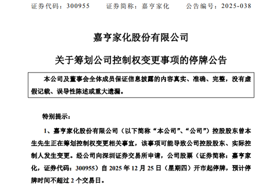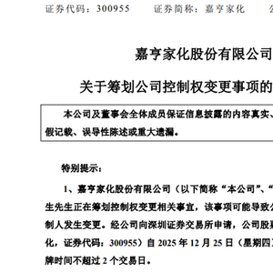 12月24日晚,嘉亨家化(300955)公告,公司于2025年12月24日收到控股股东曾本生的通知,获悉控股股东曾本生正在筹划控制权变更相关事宜,该事项可能导致公司控股股东、实际控制人发生变更。