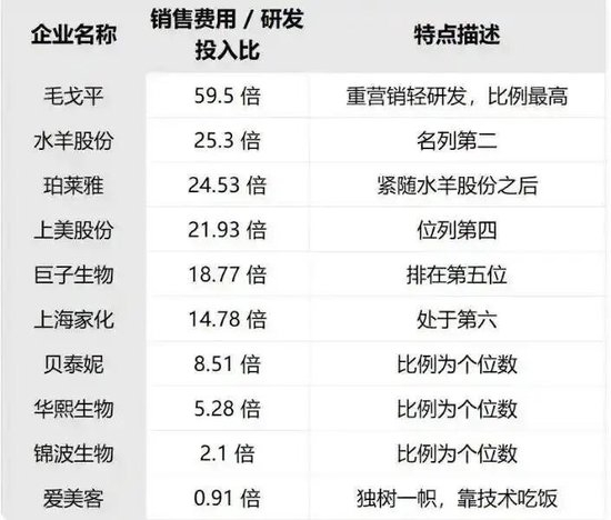 据“新黄河大鱼财经”统计,2024年毛戈平公司以59.5倍的销售费用与研发投入比,在各大国货品牌中位列第一。2025年上半年,毛戈平公司研发支出仅为1525.7万元,同比微增0.06%,占总营收比例为0.59%,在国货TOP10品牌中排名垫底。
