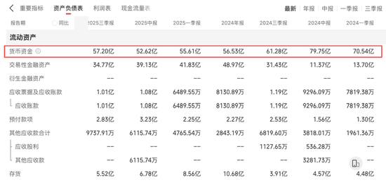 2023年末,公司货币资金余额为60.58亿,2024年中期最高时还达到79.75亿,但到了2024年末,就突然降到56.53亿,2025年中期一度降至52.62亿,成为2023年三季度(54.58亿)以来最低。