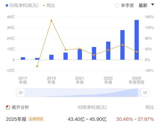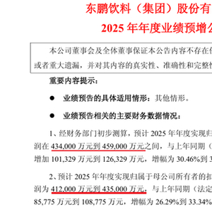 据东鹏饮料披露,预计2025年度实现归母净利润43.4亿-45.9亿,相比去年同期增长了30.46%-37.97%。扣非后的净利润也达到41.2亿元-43.5亿元,增幅26.29%-33.34%。