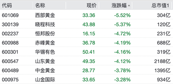 个股方面,晓程科技、西部黄金跌超5%,恒邦股份、赤峰黄金、华锡有色、山东黄金、中金黄金等跌幅均超3%。
