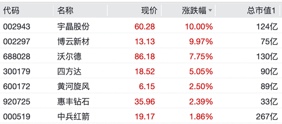 个股方面,宇晶股份、博云新材涨停,沃尔德、四方达、惠丰钻石、黄河旋风、惠丰钻石、中兵红箭等纷纷上涨。