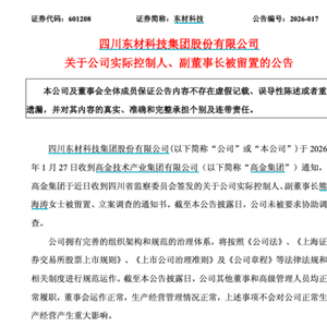 高盟新材发布的公告显示,公司于1月27日收到控股股东高金技术产业集团有限公司转发的《四川省监察委员会立案通知书》《四川省监察委员会留置通知书》,公司实际控制人、副董事长熊海涛因涉嫌犯罪,被四川省监察委员会立案调查并实施留置。目前尚待四川省监察委员会进一步调查。