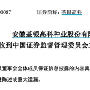 荃银高科今晚发布公告称,公司于2026年1月30日收到中国证监会下发的《立案告知书》,因公司涉嫌信息披露违法违规,中国证监会决定对公司立案。