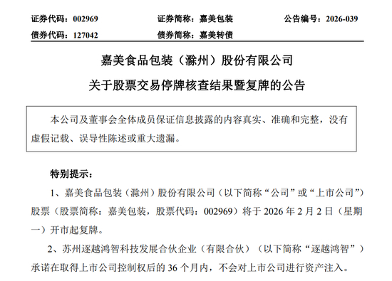 2月1日下午,嘉美包装宣布将于2月2日开市起复牌,且嘉美转债复牌并恢复转股。2月2日是“嘉美转债”最后一个交易日,当日“嘉美转债”简称为“Z美转债”,收市后“嘉美转债”将停止交易。