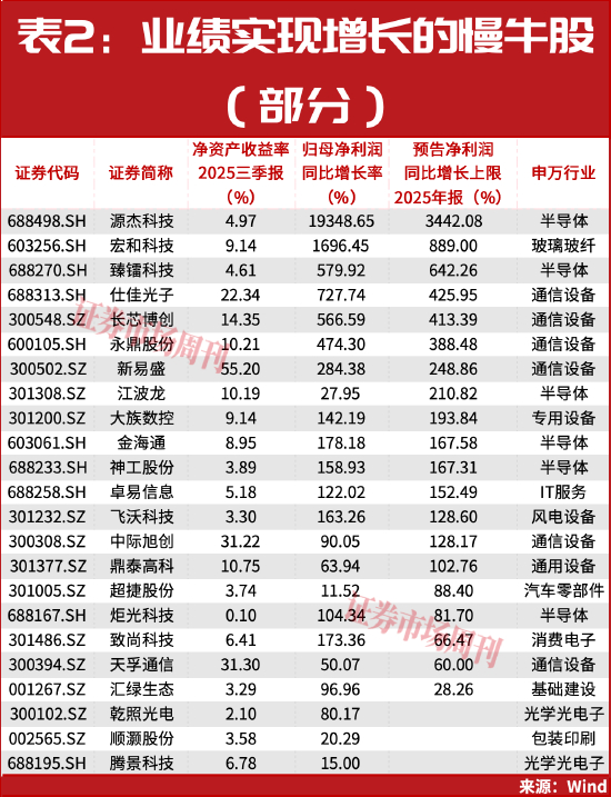 特征二:业绩增长稳健,盈利能力强。如统计表1中34只长线慢牛样本个股来看,26只去年三季报实现业绩增长,占比近八成,28只发布2025年业绩预告的公司中,24只预增,占比达近九成。源杰科技(688498)预增幅度最高,据其1月29日发布的业绩预告显示,2025年预盈1.75亿元~2.05亿元,最高增幅达到了3442.08%。公司股价自2025年4月8日低点以来已累计上涨近8倍。