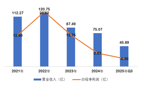 从财务数据看,山西焦化的营收和净利润自2022年分别创出120.75亿和25.82亿的历史峰值后连续三年的持续萎缩。2025年前两个季度更是持续亏损,虽然三季度单季度扭亏,但前三季度仍累计亏损5000万。