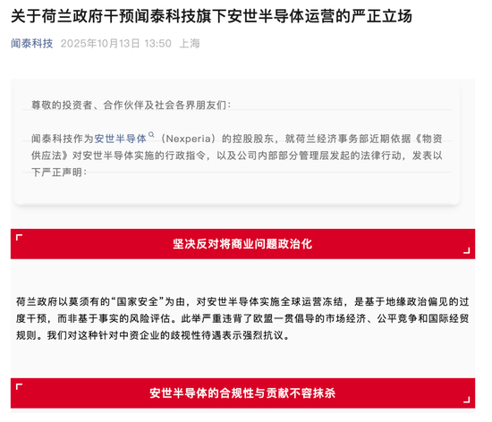 北京时间10月12日晚间,闻泰科技在官方微信公众号上发布《关于荷兰政府干预闻泰科技旗下安世半导体运营的严正立场》(下称:《声明》),《声明》包括要求荷兰政府立即撤销错误指令、停止对中国企业的系统性歧视、维护全球半导体产业链的开放与合作三项内容。
