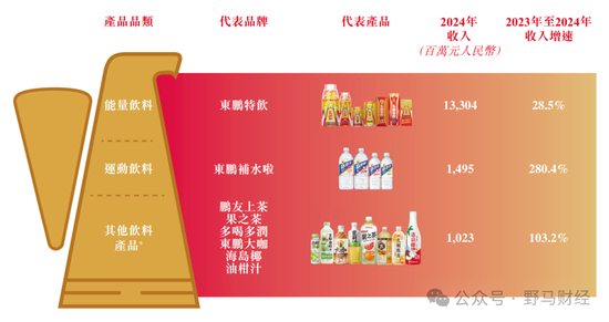 其中,运动饮料“东鹏补水啦”于2023年被划入功能饮料板块,此后,该产品增势迅猛,年营收从2023年的3.93亿元跃升至2024年的14.95亿元,占比从3.5%提升至9.4%。