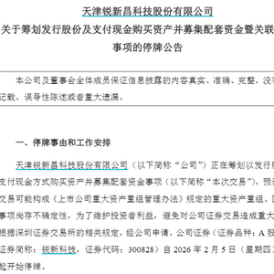 2月4日晚间,锐新科技发布公告称,公司正在筹划以发行股份及支付现金方式购买资产并募集配套资金事项(以下简称“本次交易”),预计本次交易可能构成《上市公司重大资产重组管理办法》规定的重大资产重组。公司证券(证券品种:A股股票,证券简称:锐新科技,证券代码:300828)将自2026年2月5日(星期四)开市起开始停牌。