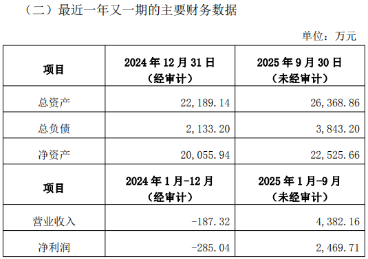 锦弘劭晖于2019年6月在深圳发起设立,专注于股权投资、科创板项目跟投及另类投资业务,从公告中披露的业绩来看,2024年营业收入、净利润均为负值,分别为-187.32万元、-285.04万元,2025年前三季度则双双转正,分别为4382.16万元、2469.71万元。