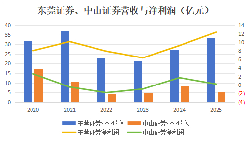 根据锦龙股份披露的未经审计的数据,2025年中山证券营业收入、净利润分别为5.5亿元、0.21亿元,同比分别下降29.12%、88.14%,是为数不多营收、净利润双降的券商,投资银行、资产管理、投资收益与公允价值变动收益等多项业务收入下降。过去几年中山证券业绩并不稳定,其中2021-2023年曾连续三年亏损。