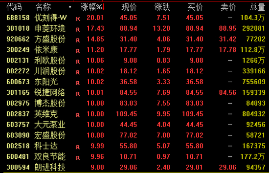 液冷服务器概念盘中强势拉升,截至收盘,优刻得20%涨停;申菱环境涨超17%,盘中一度涨停续创新高;依米康涨超10%,博杰股份、英维克、双良节能等均涨停。
