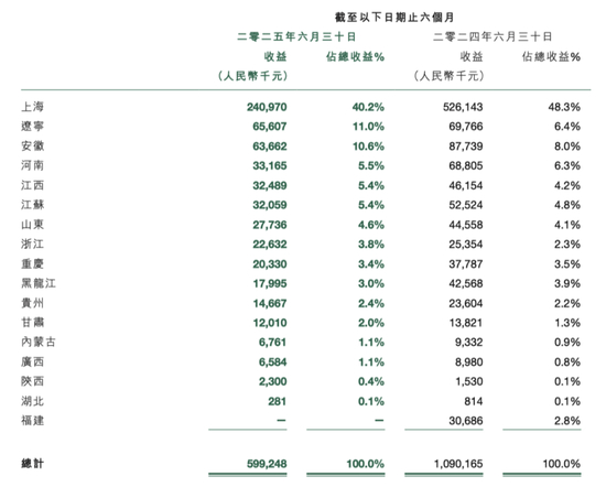 2025年上半年福寿园上海地区墓园收入直接从去年的5.26亿下跌到2.41亿,同比骤降54.2%,其他地区收入也大多下滑显著,直接拖累整体业绩。