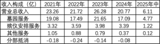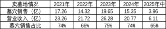 墓穴销售服务的收入也占了营业总收入的绝大比例,2024年墓穴销售收入为15.35亿,占当期收入的比例为74%。