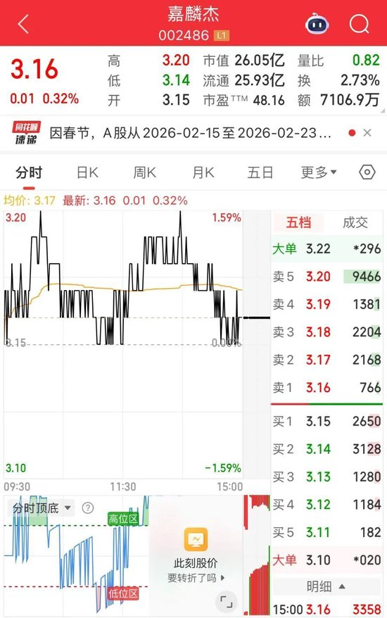 截至2月13日收盘,嘉麟杰股价涨0.32%,报3.16元/股。