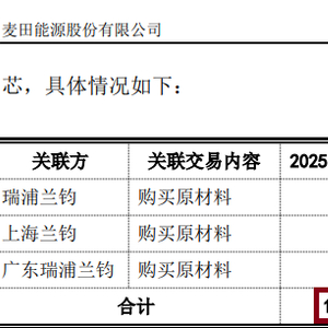 麦田能源2022-2024年、2025年上半年向瑞浦兰钧销售金额分别为0万元、0万元、 1869.76万元、7797.15万元,占当期营业收入的比例分别为0.00%、0.00%、0.55%、3.48%。