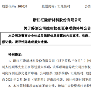 2月25日晚间, 汇隆新材(301057)发布停牌公告称,公司控股股东、实际控制人沈顺华正筹划可能导致公司控制权发生变动的重大事项,公司股票自2026年2月26日开市起停牌,预计停牌时间不超过2个交易日。公告同时提示,本次筹划事项尚处于论证磋商阶段,存在不确定性。
