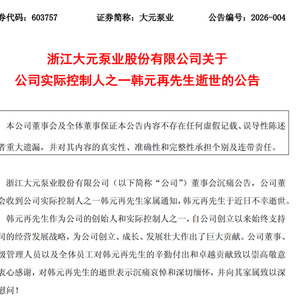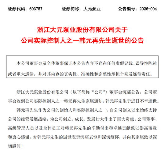 2月25日盘后,浙江大元泵业股份有限公司(以下简称大元泵业)发布公告称,其董事会收到公司实际控制人之一韩元再先生家属通知,韩元再先生于近日不幸逝世。