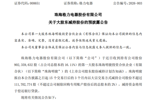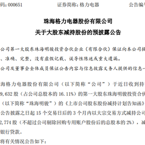 格力电器,最新公告!第一大股东拟减持逾1亿股!偿还银行贷款