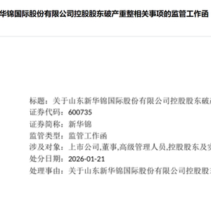 1月21日,ST新华锦收到上交所下发的监管工作函,处理事由为公司控股股东破产重整相关事项,涉及对象包括上市公司、董事、高管、控股股东及实控人。