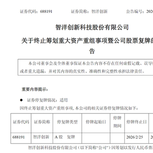 2月25日晚,智洋创新(688191)公告称,公司此前筹划以发行人民币普通股股票、定向发行可转换公司债券(如有)、支付现金(如有)等方式购买深圳市灵明光子科技有限公司(简称“灵明光子”)控股权,同时拟募集配套资金。因交易双方未能就交易核心条款达成一致意见,经审慎研究,公司决定终止筹划本次重大资产重组事项。公司股票自2月26日开市起复牌。