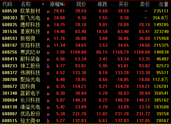 半导体板块盘中强势拉升,截至收盘,欧莱新材、聚飞光电20%涨停,德邦科技、星宸科技涨超14%;寒武纪午后大幅走高,一度涨近10%,收盘涨约8%,最新市值4929亿元。