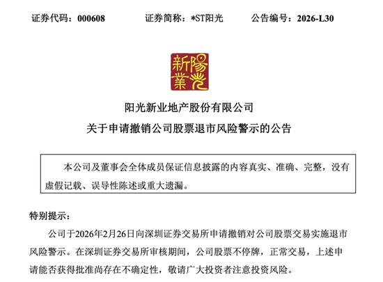 2月26日,*ST阳光(000608)公告,公司已向深交所提交了关于撤销对公司股票交易实施退市风险警示的申请。