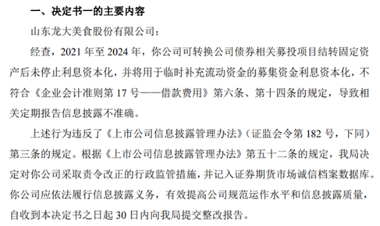 2025年4月,龙大美食收到山东证监局《监督检查通知书》,监管部门于当日至5月16日对公司2024年度信息披露情况进行了现场检查。检查发现,公司在公开发行可转换公司债券的利息账务处理上,与《企业会计准则第17号——借款费用》的规定存在差异。