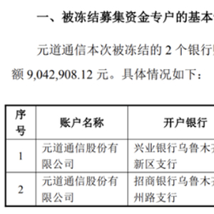 需要指出的是,元道通信本次被冻结的银行账户均为募集资金专项账户,合计被冻结金额为904.29万元。