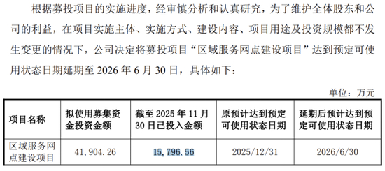 公告显示,截至2025年11月30日,区域服务网点建设项目已投入1.58亿元募集资金,投资进度为37.7%。未来半年内,公司能否顺利完成该项目剩余六成以上的进度,仍存在不确定性。