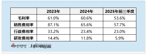 公司长期销售费用率远超毛利率,2023年、2024年及2025年前三季度销售费用率分别达87.1%、65.6%、57.7%,叠加行政费用、研发费用等各项开支,进一步侵蚀盈利。尽管公司在三费控制方面已有所努力,但销售开支作为核心获客方式,下降幅度有限,盈利转正仍面临较大压力。