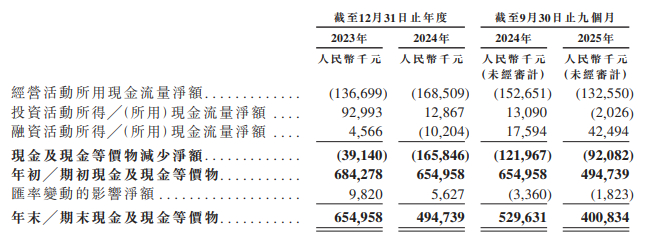 现金流与资金储备方面,公司长期面临经营性现金流净流出的状况,2023年、2024年及2025年前三季度经营活动现金流流出额分别为1.37亿元、1.69亿元及1.32亿元。虽然公司在2016年-2021年完成5轮融资,从私募市场获得近2.4亿美元资金,2021年D轮融资后投后估值达6亿美元,但受长期现金流出影响,资金储备持续缩水,截至2025年9月末,公司现金及现金等价物仅剩4.0亿元。若此次上市未能成功拓宽融资渠道,公司后续经营发展将面临较大的资金链风险。