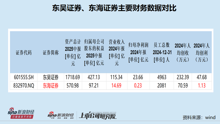 以2024年的业绩数据、2025年上半年的资产数据为口径,两家券商重组后,新的东吴证券的总资产增加570亿元排名可以增长几位,但营收和净利润增幅有限,尤其是净利润几乎没有增长。按照2024年的业绩口径计算,东吴证券控股东海证券,业绩排名没有太大变化,在行业中还是原有的竞争梯队。