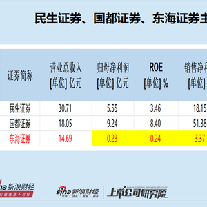 2024年,民生证券、国都证券、东海证券分别实现营收30.71亿元、 18.05亿元、14.69 亿元,东海证券垫底;分别实现归母净利润5.55亿元、9.24亿元、0.23 亿元,东海证券仅为国都证券的四十分之一左右,是民生证券的二十三分之一;三家券商的净资产收益率分别为3.46% 、8.4% 、0.24 %,东海证券仅是国都证券的一个零头;三家券商的净利率分别为18.15%、51.38%、3.37%,东海证券垫底且畸低。