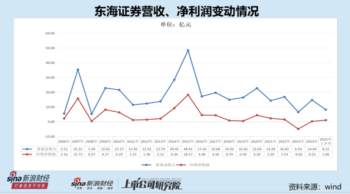 而东海证券近十年大踏步倒退。2015年,东海证券的营收为48.41亿元,仅比东吴证券低20亿元;2024年东海证券营业收入降至14.69亿元,比2015年低69.65%(接近7成),比东吴证券同期低100亿元。