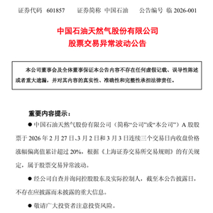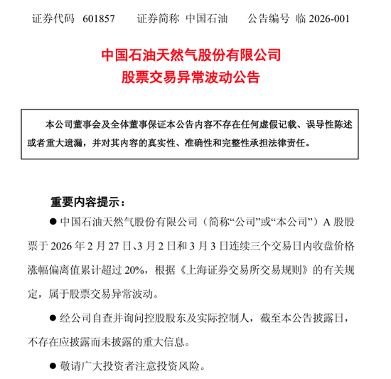 中国石油公告称,公司A股股票于2026年2月27日、3月2日和3月3日连续三个交易日内收盘价格涨幅偏离值累计超过20%,根据《上海证券交易所交易规则》的有关规定,属于股票交易异常波动。近期国际原油市场受地缘局势、供需格局等多重因素影响,价格呈现宽幅震荡走势,短期油价波动存在较大不确定性,敬请广大投资者注意风险。
