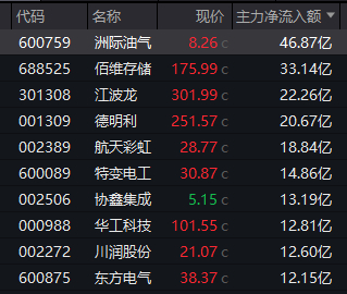 个股方面,洲际油气获得逾46亿元主力资金净流入,佰维存储获得逾33亿元净流入,江波龙、德明利均获得超20亿元净流入,航天彩虹、特变电工等6股也获得超10亿元净流入。洲际油气(600759)今日连续第三天涨停。
