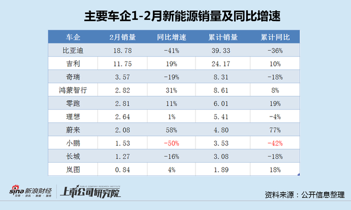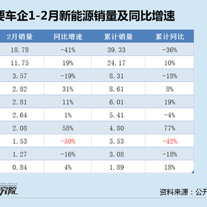前两个月,头部车企新能源销量表现喜忧参半。其中,蔚来交付4.80万辆,因基数较低,同比大增77%,增速居首;小鹏汽车交付3.53万辆,同比下降42%,同时2月交付量同比大跌50%,单月和累计销量增速均垫底头部车企,新年开局不利。