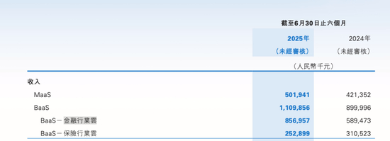 百融云创整体业务分为两大板块,一是Maas(模型即服务),即数据查询服务;二是BaaS(业务即服务),财报中解释帮客户促成的交易。BaaS业务中,除了前述金融行业云业务,还单列了一项保险服务云业务。
