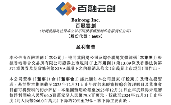 针对业绩下滑,百融云创称,集团2025年在人工智能(AI)领域之投入较2024年大幅增长,以调节AI的快速发展,包括着重于招聘AI领域人才,以夯实人才基础并增强AI核心竞争力;数据算法成本增加;IDC机房相关投入导致费用增加,以及随之产生的各项费用。