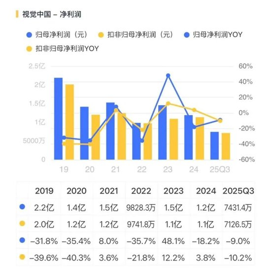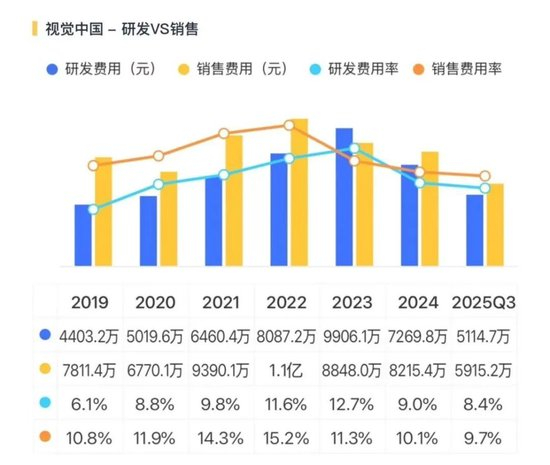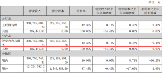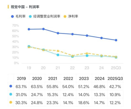 赚钱能力的下降在毛利率上体现得尤为明显。2025年上半年,核心业务“视觉内容与服务”毛利率为42.4%,同比下滑了9.5个百分点。