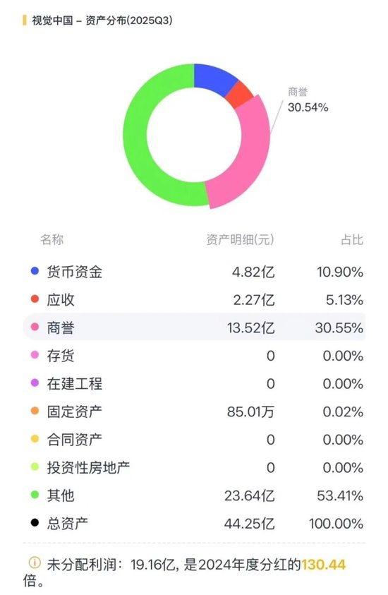 自2014年借壳上市后,视觉中国便通过一系列高溢价收购扩张业务版图,积累了海量独家版权素材,这些资产构成了公司极高的商誉。2025年三季度末,其商誉资产高达13.5亿元,占其总资产的30.6%。