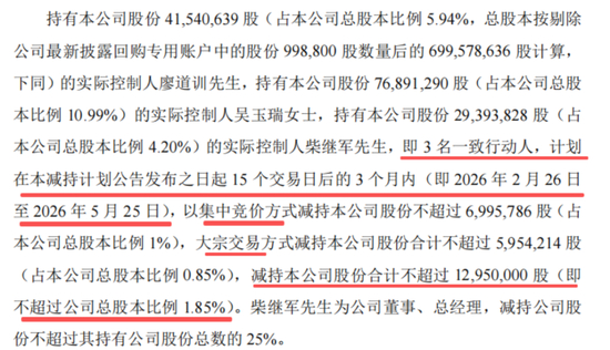 2026年1月28日,公司发布的《关于实际控制人减持公司股份的预披露公告》显示,廖道训、吴玉瑞、柴继军三人因自身资金需求计划在2026年2月26日-2026年5月25日,通过集中竞价和大宗交易的方式合计减持公司不超过1295万股(占公司总股本的1.85%)股份。届时,到手几个小目标不成问题。