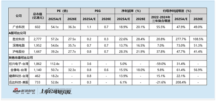 具体来看,广合科技本次发行市值对应2025年PE为54.1倍、2026年预测PE为36.3倍,2025年估值略高于A股可比公司平均水平,2026年预测估值更是位列A股可比公司首位。而从体量来看,A股可比公司在收入、净利润规模上均显著优于广合科技,公司估值溢价缺乏规模支撑。